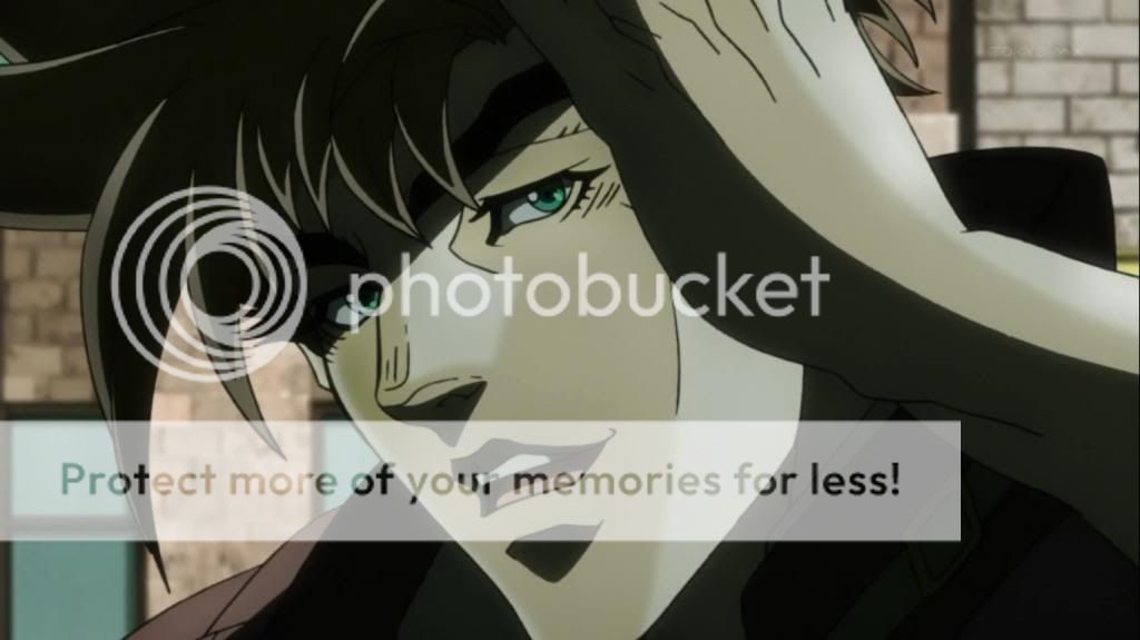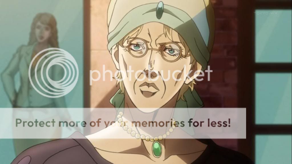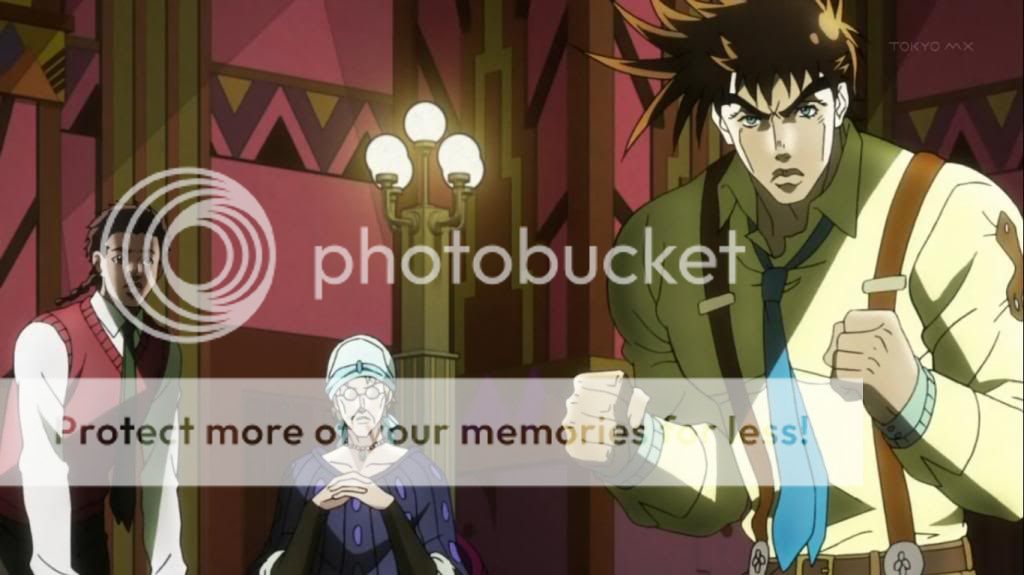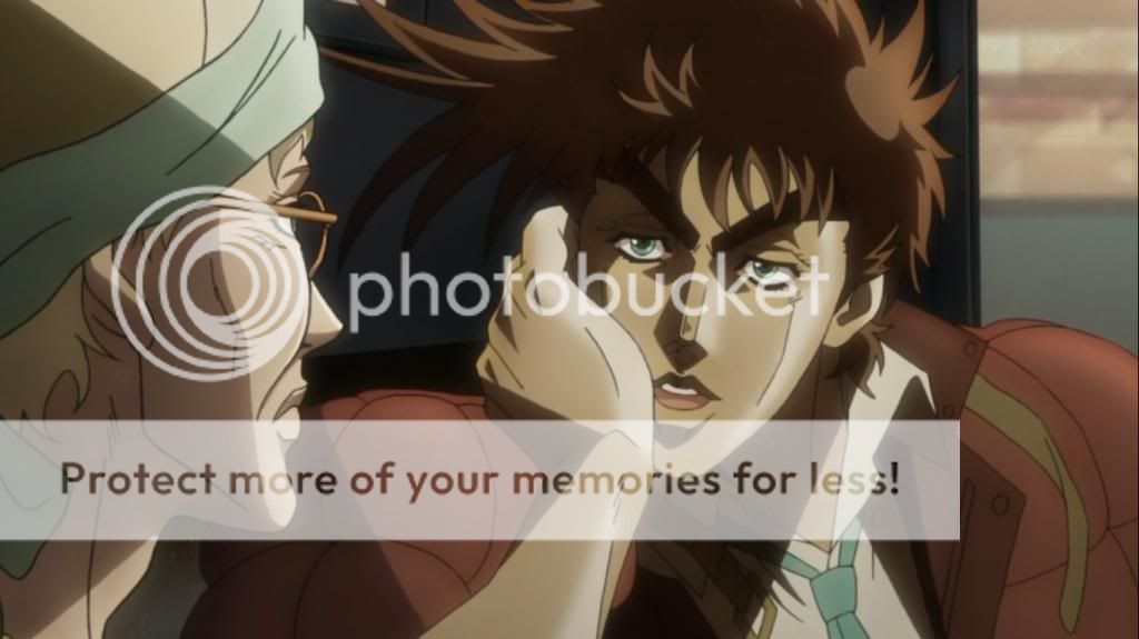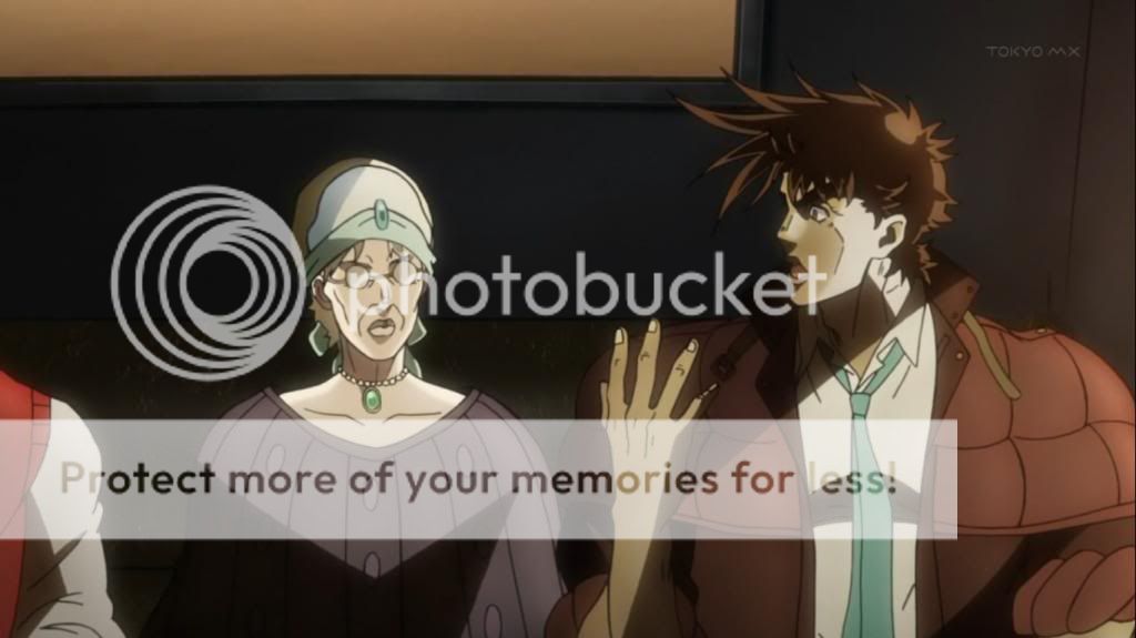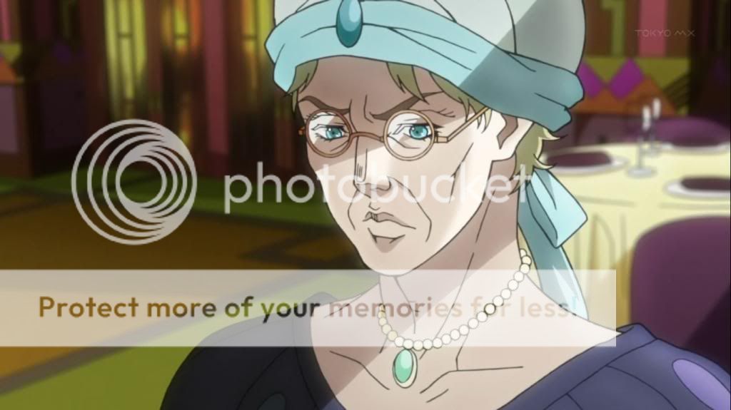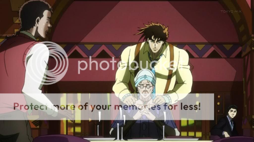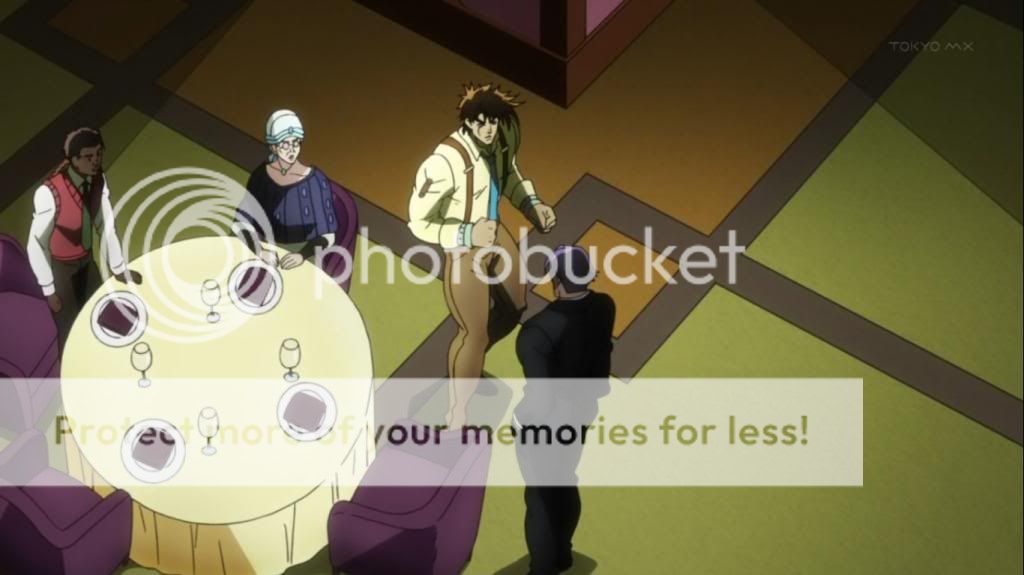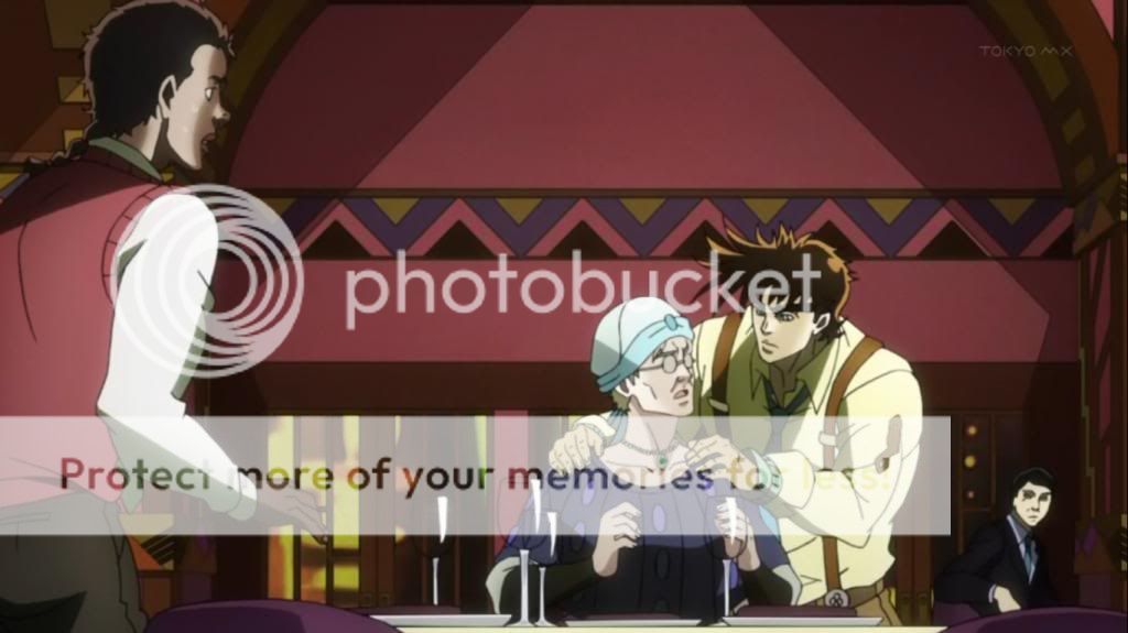 而喬瑟夫見狀,也上前表明自己會守護她的決心。不過在漫畫中,雖然艾莉娜的感嘆是在這的沒錯,不過喬瑟夫的安撫其實是在之後才出現的,場景也不是在這間餐廳,動畫算是將其融合,一次交代出來吧。